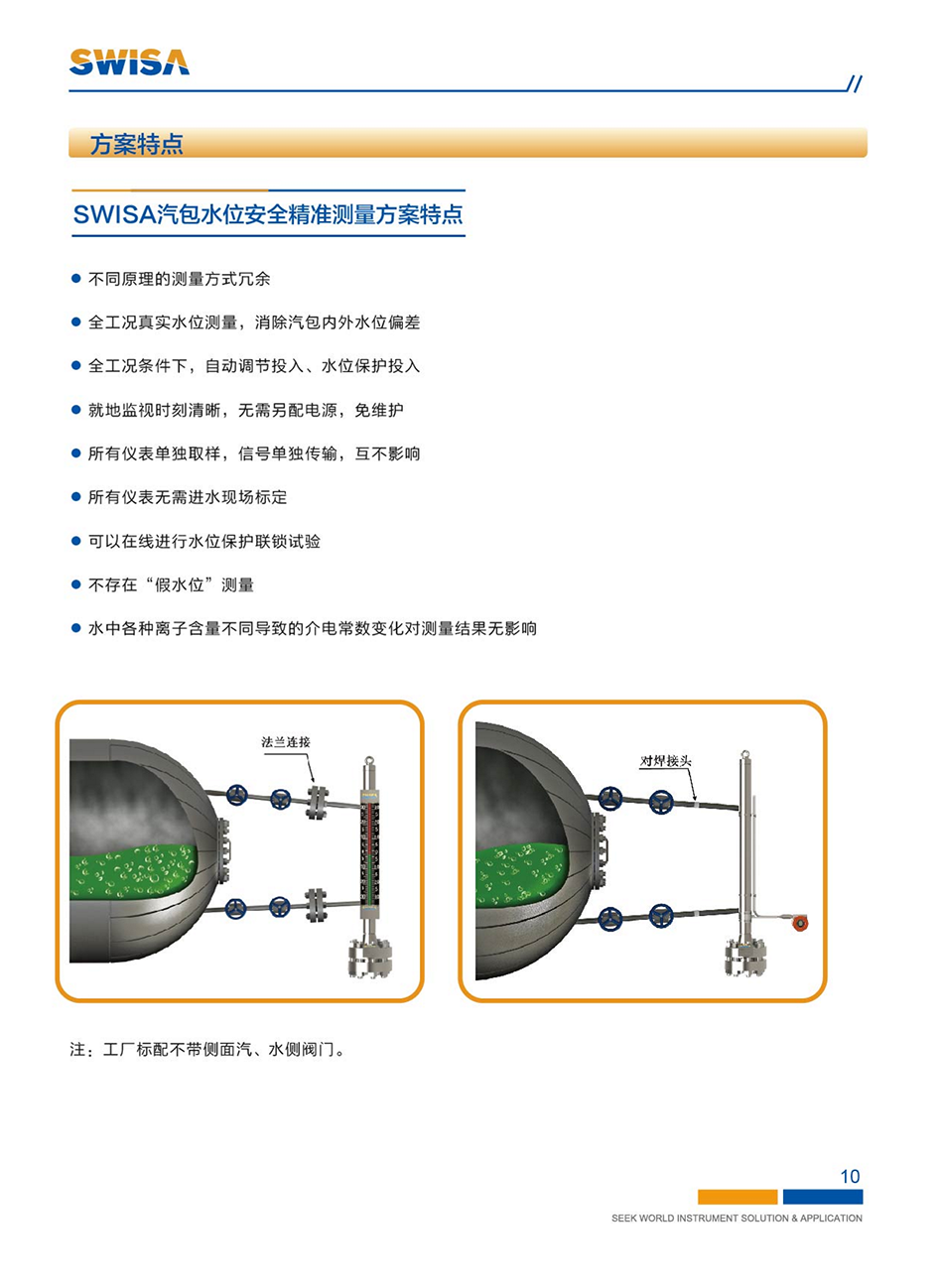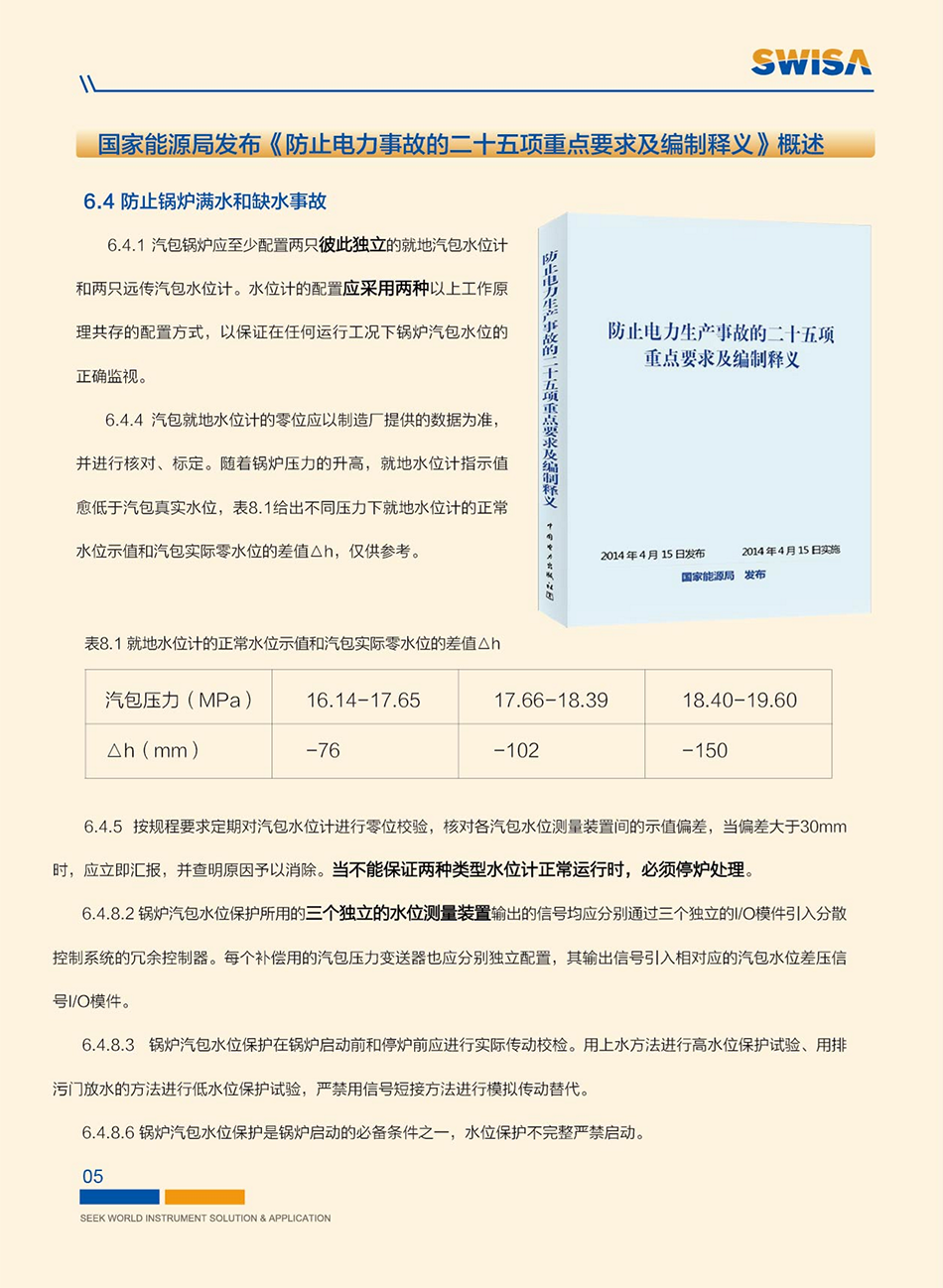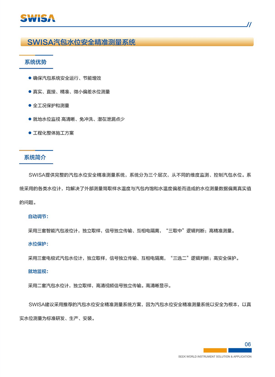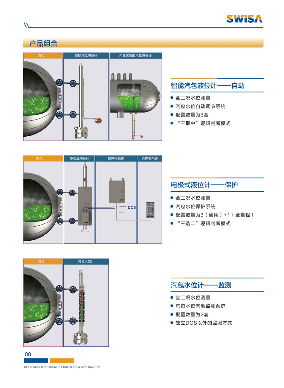 SWISA提供完整的汽包水位安全精準測量系統,系統分為三個層次,從不同的維度監測、控制汽包水位。系統采用的各類水位計,均解決了外部測量筒取樣水溫度與汽包內飽和水溫度偏差而造成的水位測量數據偏離真實值的問題。