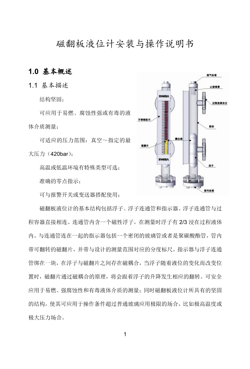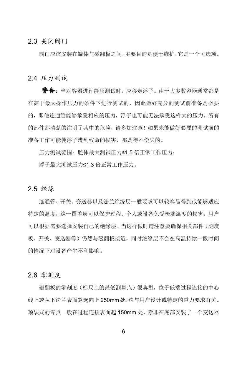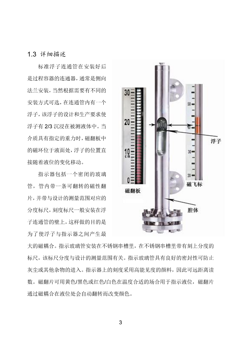 磁翻板液位計的基本結構包括浮子、浮子連通管和指示器。浮子連通管與過程容器直接相連。連通管內含一個磁性浮子,在測量時浮子有2/3浸在過程液體內。與連通管連在一起的指示器包括一個密閉的玻璃管或者是聚碳酸酯管,管內帶可翻轉的磁翻片,并帶與設計的測量范圍對應的分度標尺。指示器與浮子連通管綁在一塊,在浮子與磁翻片之間存在磁耦合,當浮子隨著液位的變化而改變位置時,磁翻片通過磁耦合的原理,將會跟著浮子的升降發生相應的翻轉。可安全應用于易燃、強腐蝕性和有毒液體介質的測量;同時磁翻板液位計所具有的堅固的結構,使其可應用于操作條件超過普通玻璃應用極限的場合,比如極高溫度或極大壓力場合。