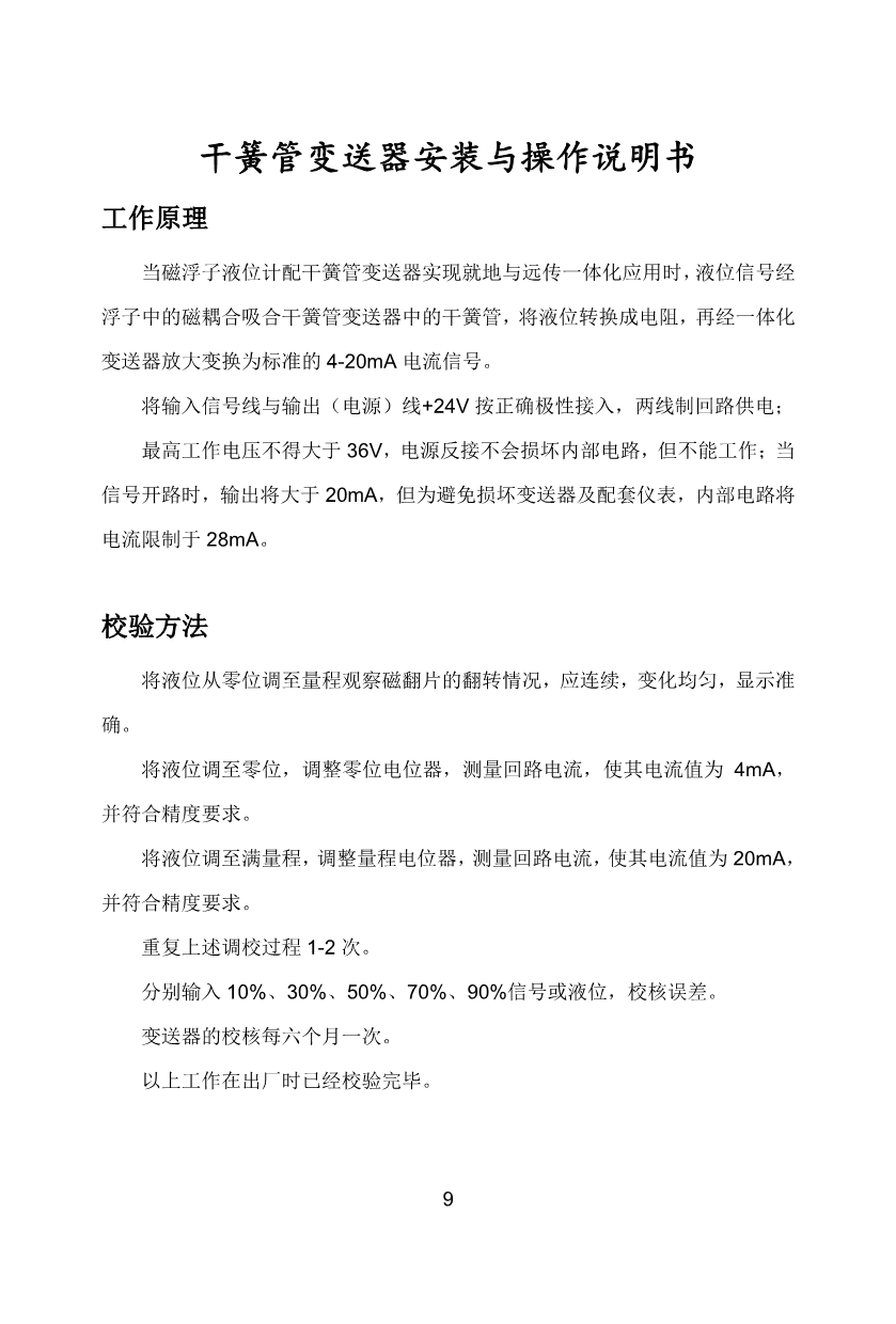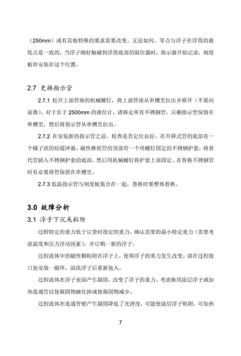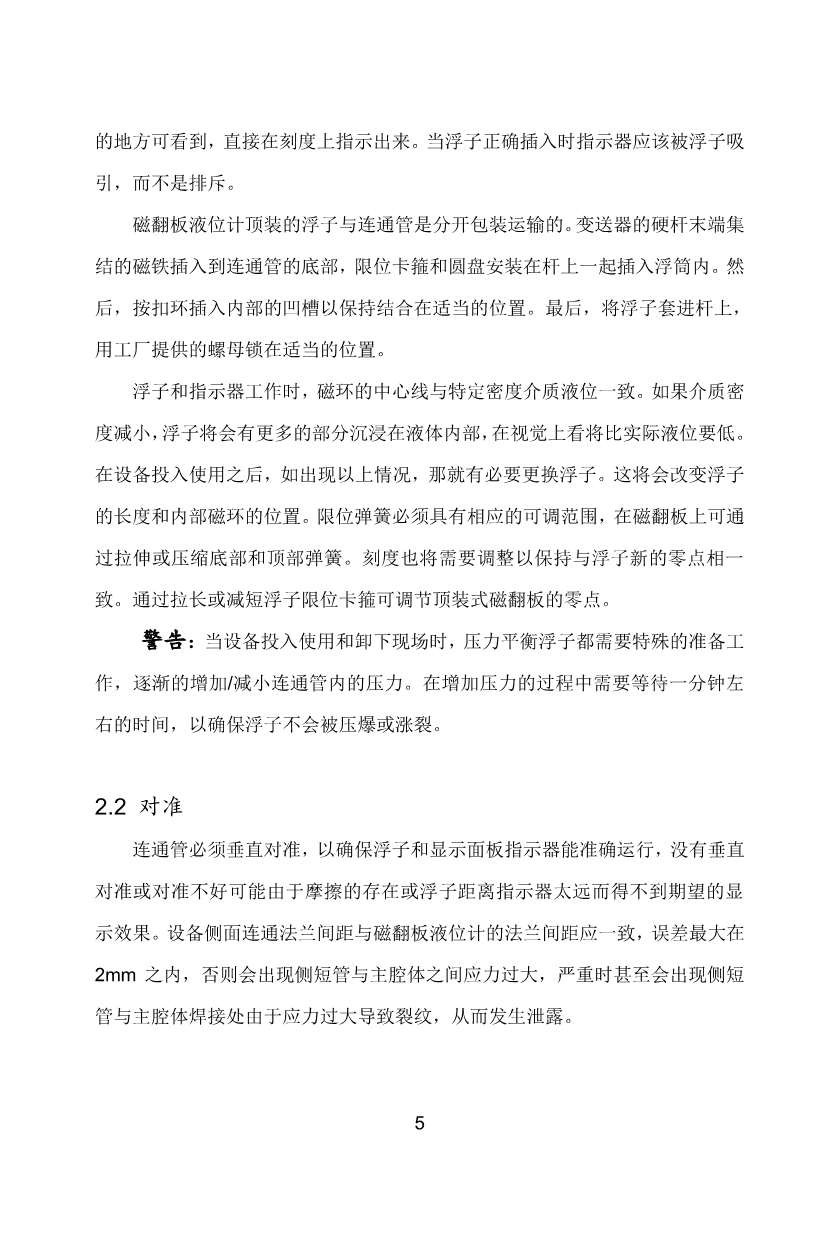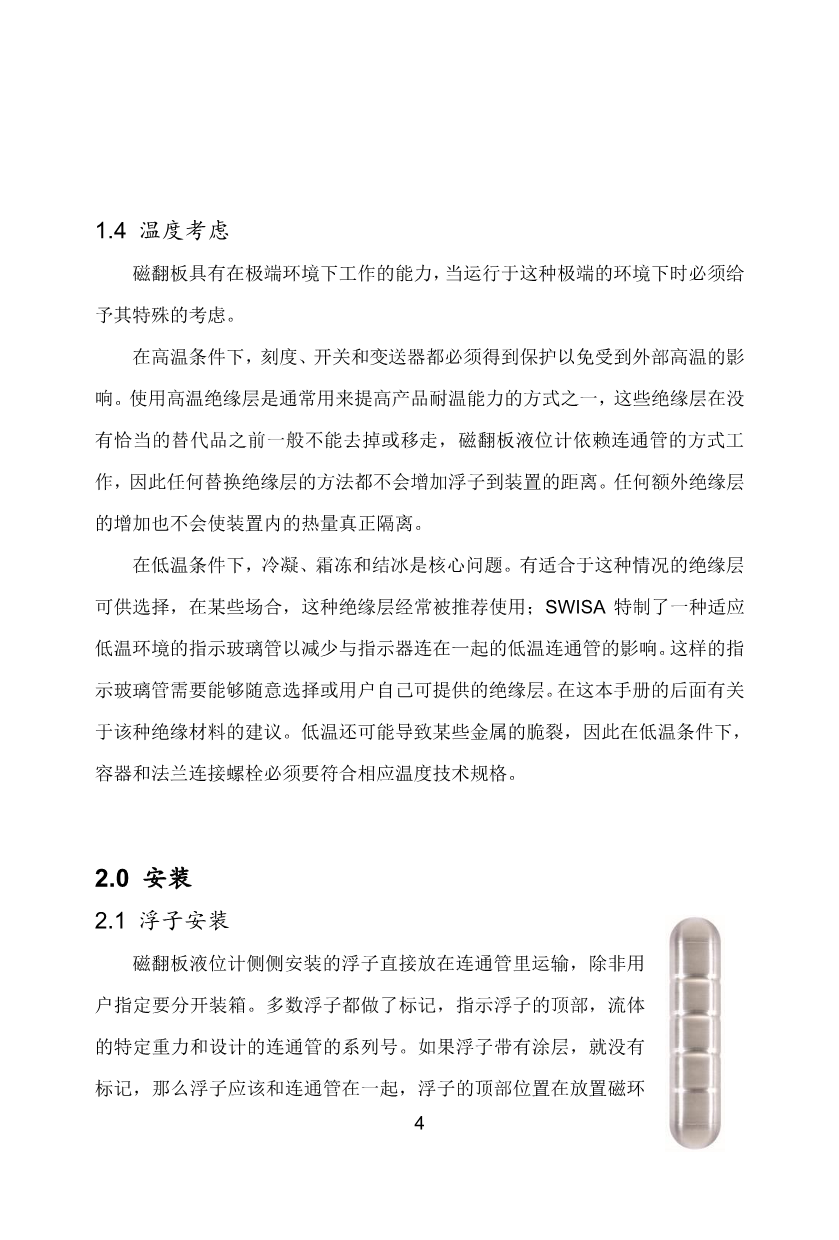 磁翻板液位計的基本結構包括浮子、浮子連通管和指示器。浮子連通管與過程容器直接相連。連通管內含一個磁性浮子,在測量時浮子有2/3浸在過程液體內。與連通管連在一起的指示器包括一個密閉的玻璃管或者是聚碳酸酯管,管內帶可翻轉的磁翻片,并帶與設計的測量范圍對應的分度標尺。指示器與浮子連通管綁在一塊,在浮子與磁翻片之間存在磁耦合,當浮子隨著液位的變化而改變位置時,磁翻片通過磁耦合的原理,將會跟著浮子的升降發生相應的翻轉。可安全應用于易燃、強腐蝕性和有毒液體介質的測量;同時磁翻板液位計所具有的堅固的結構,使其可應用于操作條件超過普通玻璃應用極限的場合,比如極高溫度或極大壓力場合。