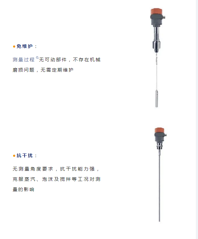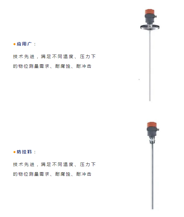 工作過程發射波能量集中,損失小,方向性好;輻射低,不會對設備和人員造成輻射傷害。可用于液體、漿料、粉末和顆粒等介電常數比較低的介質進行接觸式連續測量。適用于溫度、壓力變化大,有惰性氣體或蒸汽存在的場合。